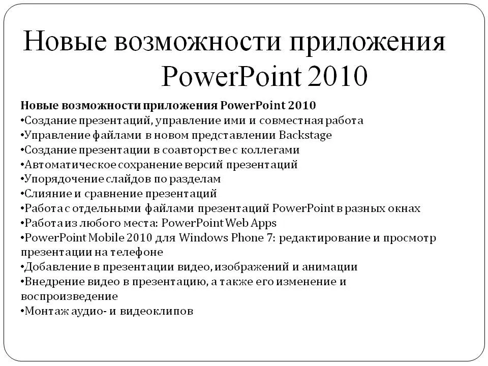 Позволяет размещать на слайдах текст, изображения, анимацию, ссылки, видео- и аудио объекты. Является одним из компонентов Microsoft Office 2010, устанавливается в составе офисного пакета или отдельным приложением.